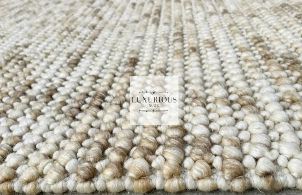 These subtle streaks are artfully integrated into the looped wool texture, offering a soft interplay of tones that shifts beautifully with the light. The result is a rug that feels both organic and elevated — plush underfoot, visually textured, and tailored for high-end interiors that appreciate nuance.
